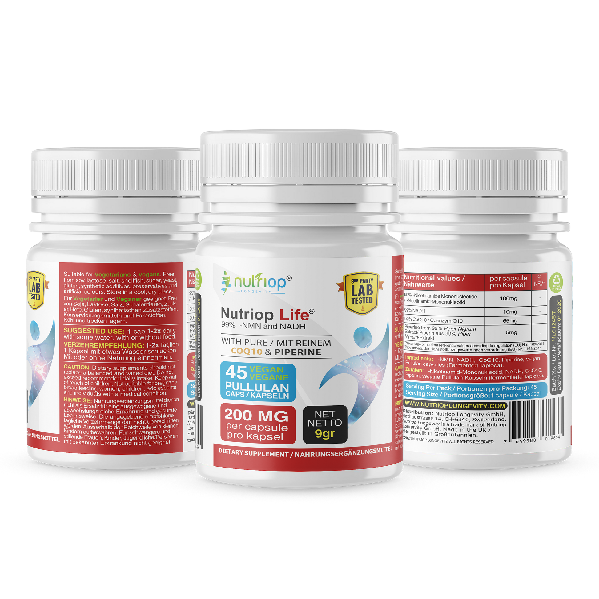 Our new Nutriop Longevity® Life formulation combines NMN with NADH and CoQ10 to boost mental and physical energy and combat the effects of aging.