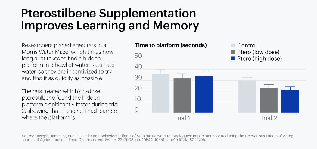 In mice, this enhanced moods and lowered anxiety, while rats fed a pterostilbene-rich diet saw increased cognition and memory. A separate study on rats observed an increase in new cell growth in the memory center of the brain.